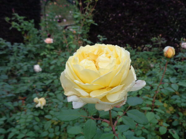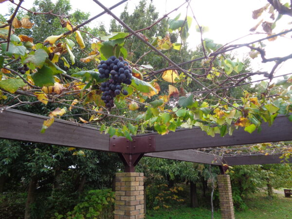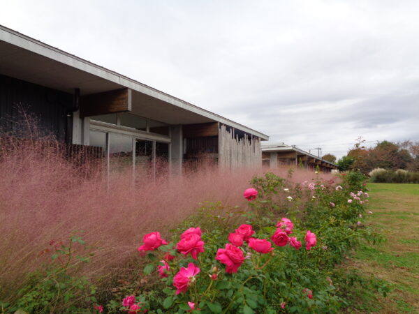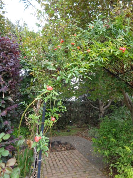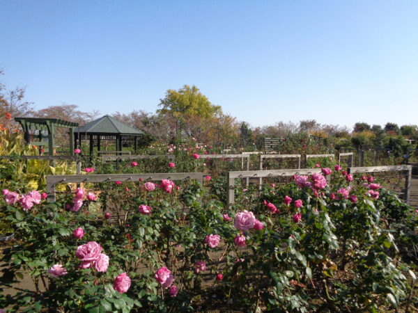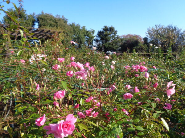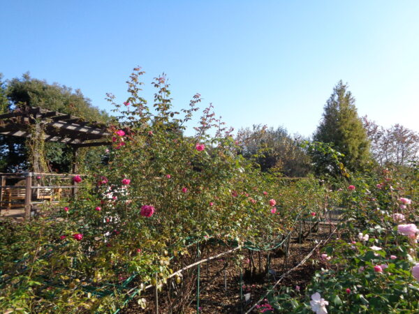 湘南の海をイメージした、大きく波打つ形のつる棚にたくさんの秋【バラ】が見ごろを迎えています!《薔薇の轍》