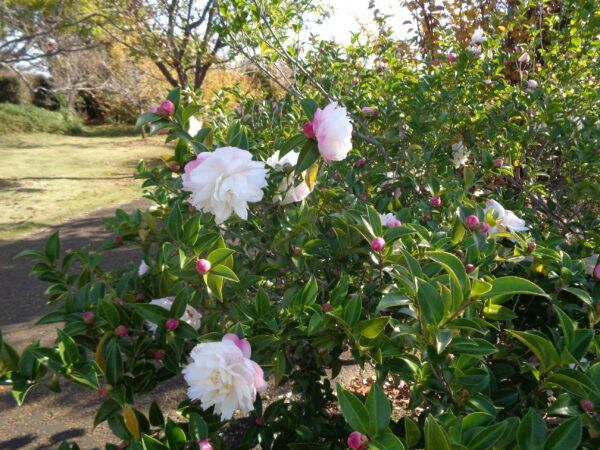 【カメリア】サザンカ’朝倉’・・・たくさんの蕾がいっぺんに色づき、次々と開花しています!!《紅葉重ねのほとり》北