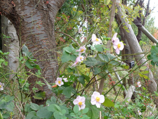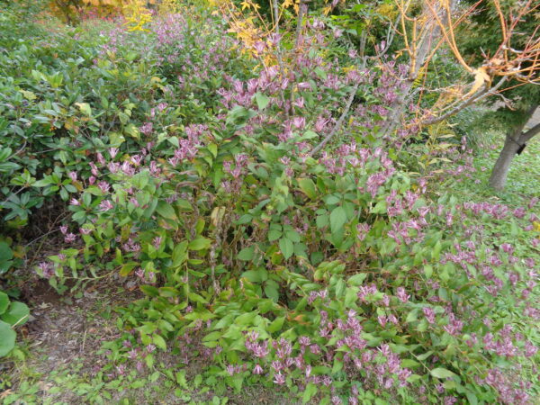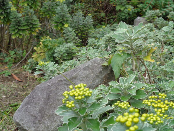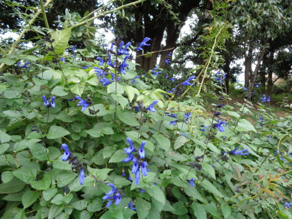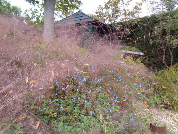 【ケラトスティグマ・グリフィシー(ブータンルリマツリ)】青くて小さな花がシャワー状に広がりを見せています《スペシャルショーガーデン》