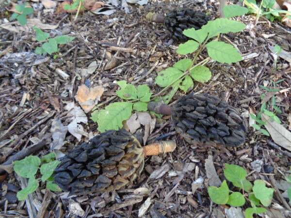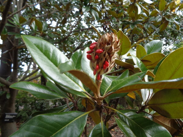 この時期に拾える木の実【タイサンボク】の実。花が咲き終わったあとの中心部分、雌しべの部分に赤い実をつけます。不思議な形の果実が木の高い位置になっていました!