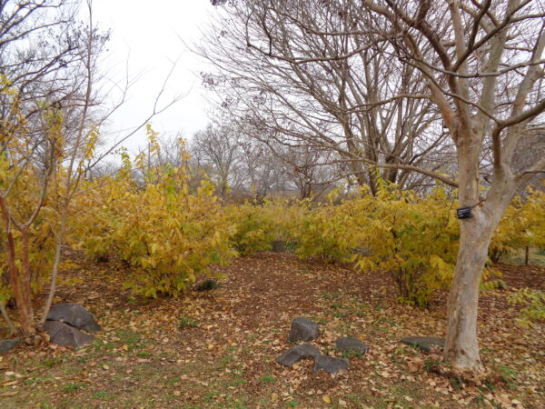 【ロウバイ】はたくさんの蕾を付けて葉を黄色くさせています《尾根見の池》西側