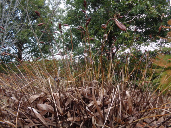 【シラン】(紫欄)が立ち枯れ、ほそ~い茎に種をつけています