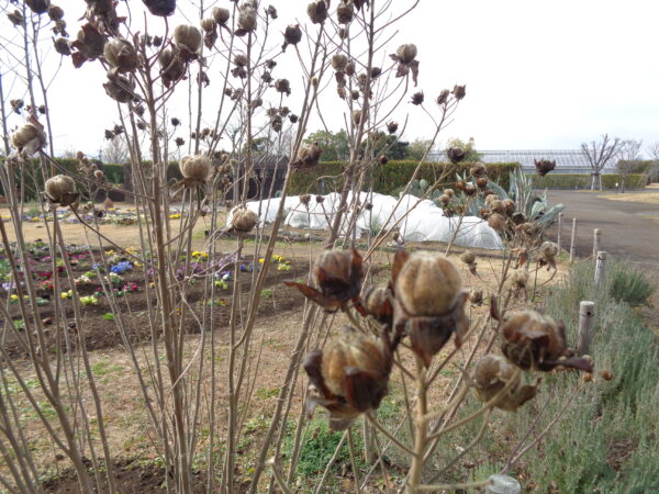 【フヨウ】実が開いても割れ目が上を向いているので、種はその場に落ちず、親株から離れたところまで風に飛ばされるような構造に。