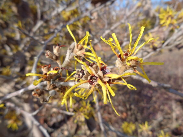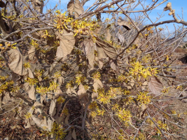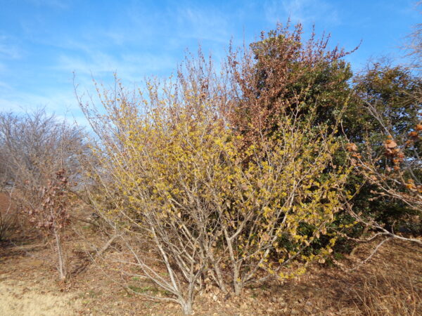 【マンサク】が見ごろのピークに!!離れたところからでも、鮮やかな黄色が目立ちます