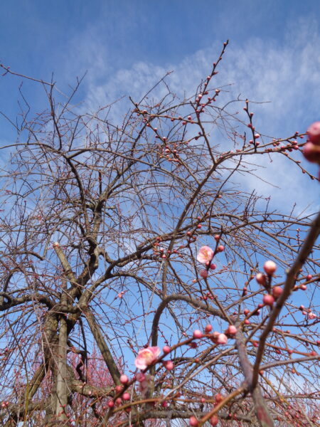 【ウメ】’呉服枝垂’は、少しずつ淡いピンクの花を咲かせはじめています《三日月山》。開花のスピードも品種によって随分ちがうものですね!