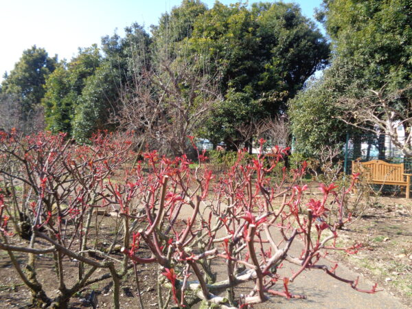 【バラ】紅色の新芽が、いつもの年より早く動き出しているようです・・