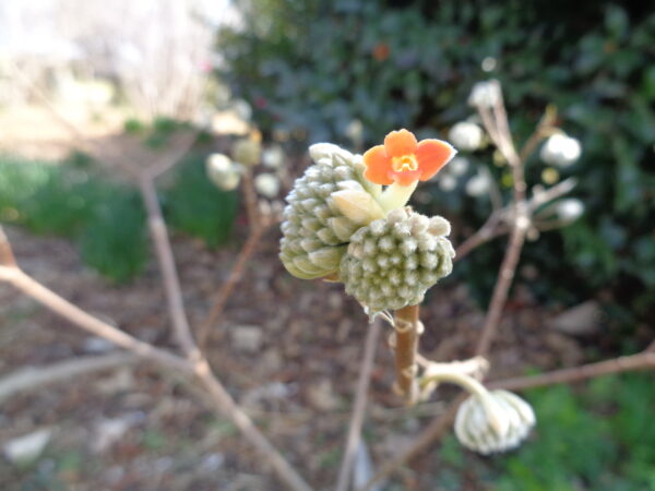 ちっちゃな【ミツマタ】の一番花が咲きました!枝の先が必ず三つに分かれることからミツマタと名づけられたそうです。