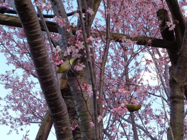 早咲き【サクラ】の花びらがチラチラと舞っていたので近づいてみると、たくさんのメジロが仲良くお食事中でした・・・