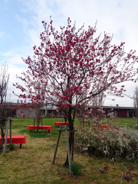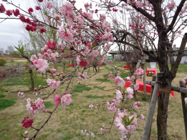 【ハナモモ】’ゲンペイ’や【ベニスモモ】が見ごろを迎えました!お花見ベンチもございます(⋈◍>◡<◍)。🍡
