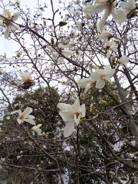 【ハクモクレン】ひらひら揺れる美味しそうな花弁と蕾(笑)に惹かれてしまうのは野鳥も一緒。。。夕暮れになると鳥たちが蕾をついばみに来ます🕊🕊🕊《往にし方の小庭》など