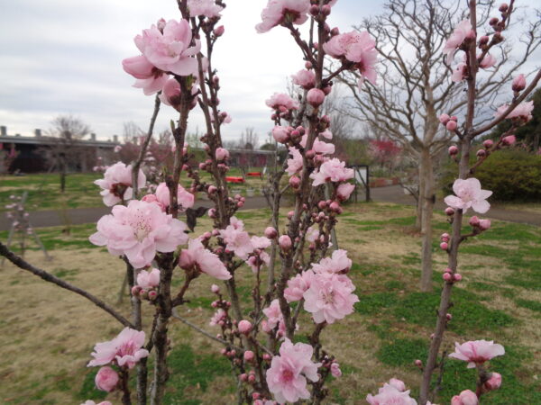 蕾をたくさん付けている【ハナモモ】’テルテモモ’・’テルテベニ’・’テルテヒメ’も、次々とスピードを上げて咲き始めています