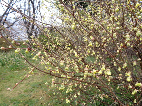 【ヒュウガミズキ】【トサミズキ】は、優し気な淡黄色の小さな花をぶら下げて咲いています