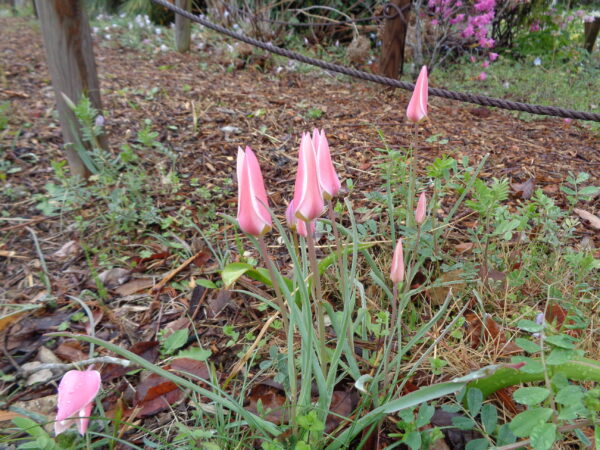 シャープな花姿をもった原種系の【チューリップ】が見られます《往にし方の小庭》など