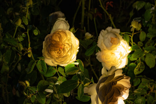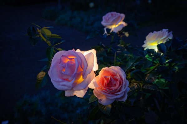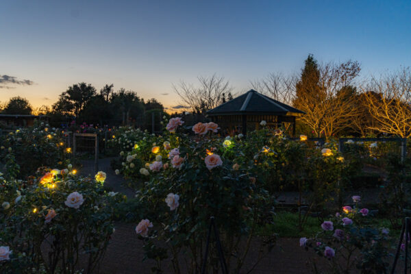 秋の夕日に照らされ静かに陽が落ちるのを待つバラたちを、照明作家・ゲンマ氏が美しく演出します。